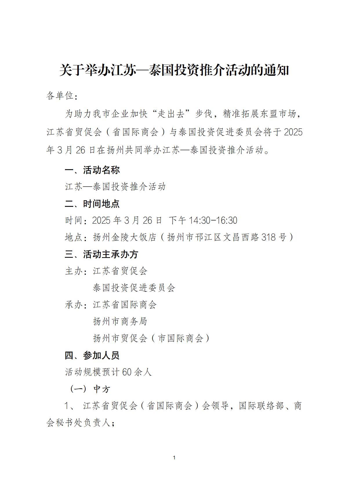 关于举办江苏—泰国投资推介活动的通知